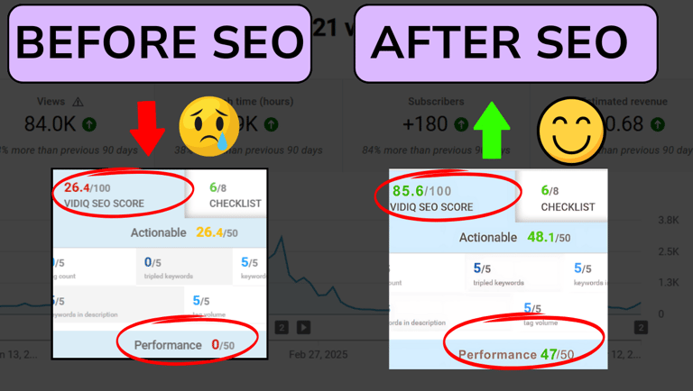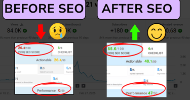 I implemented organic YouTube SEO strategies to improve the VIDIQ SEO score from 26.4 to 85.6 and increased the performance score from 0 to 47/50. This optimization helped boost video visibility, engagement, and subscriber growth for the channel.4o