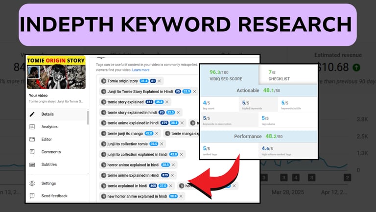 I perform in-depth keyword research tailored to rank content on YouTube, Google, or any other search engine. By analyzing high-volume, low-competition keywords, I ensure maximum visibility and better SEO scores—just like I did here with a 96.3/100 VidiQ SEO score and top-ranked tags.